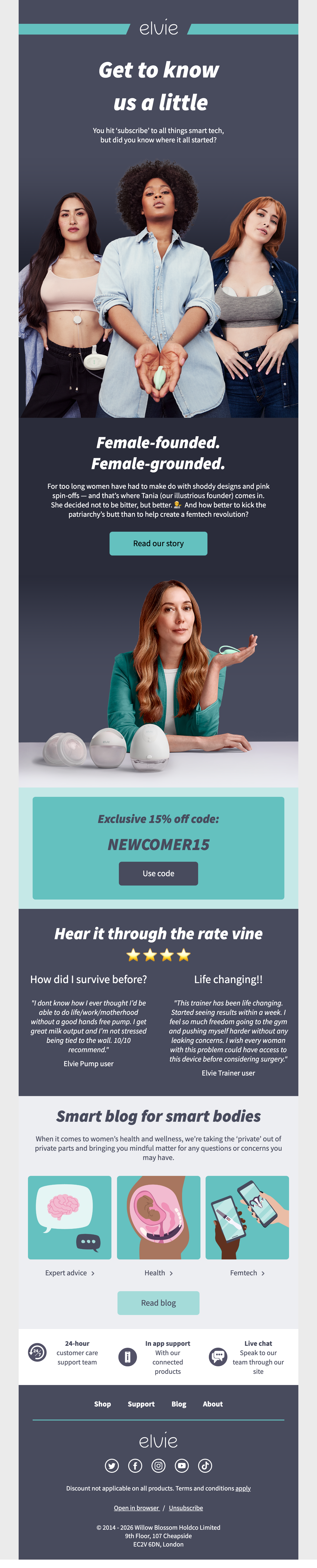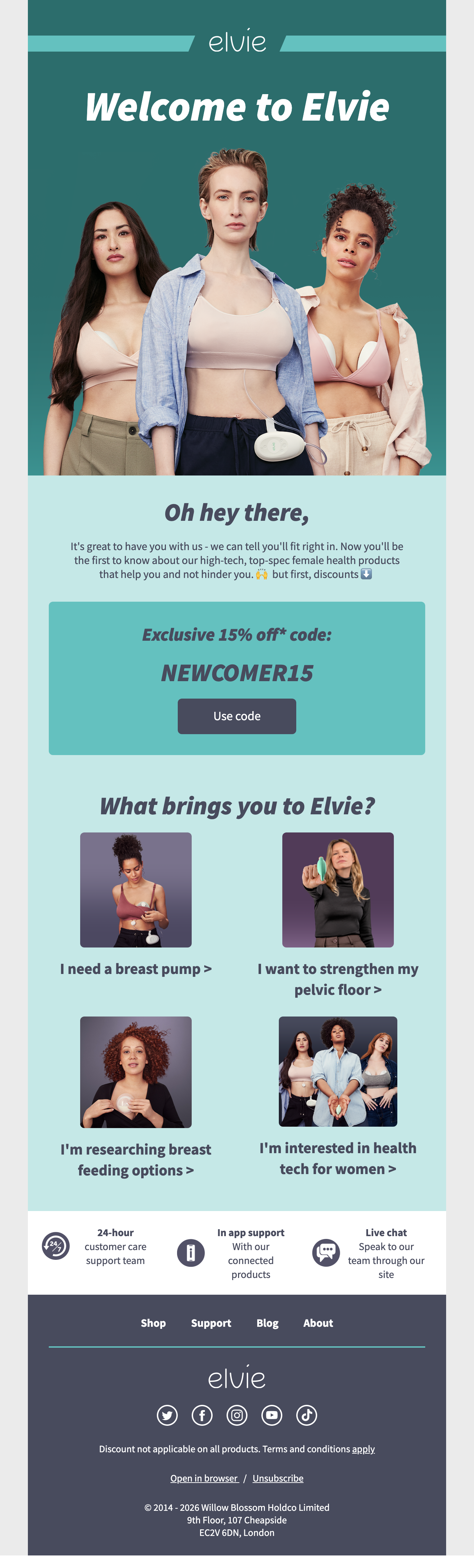 Browse Elvie's complete welcome email sequence — every email, subject line, timing, and design deconstructed. See exactly how their 2-email flow converts new subscribers.