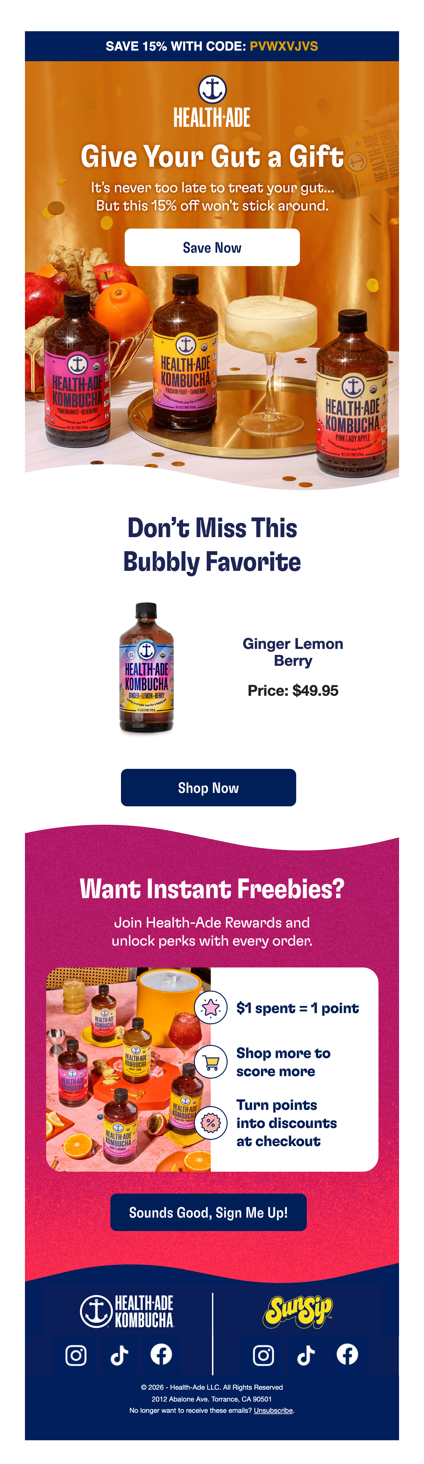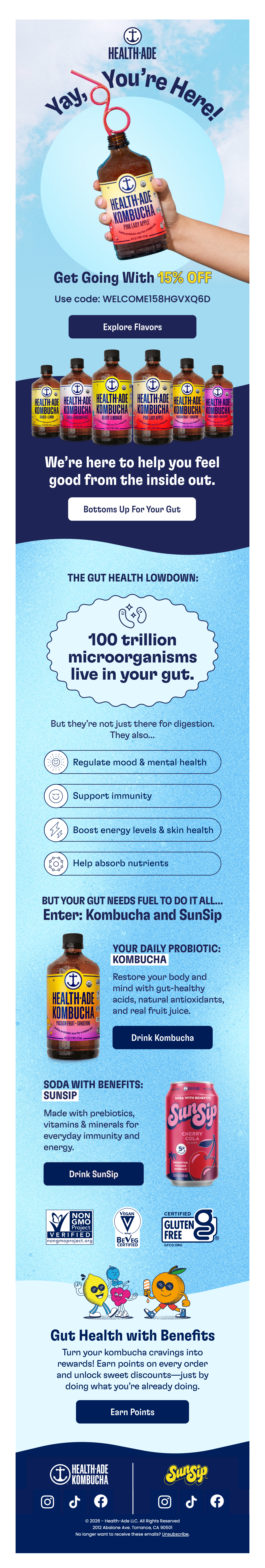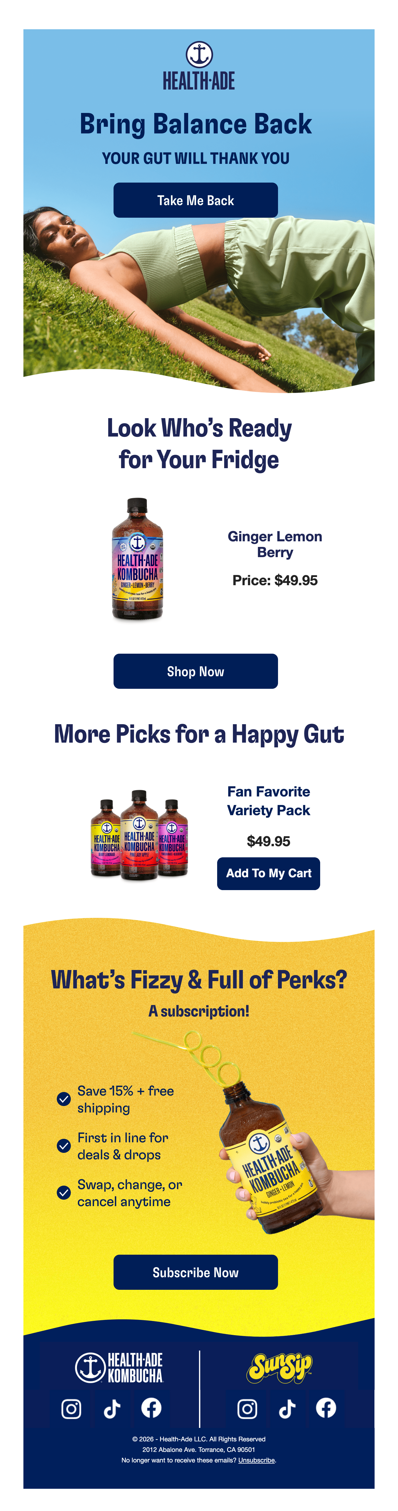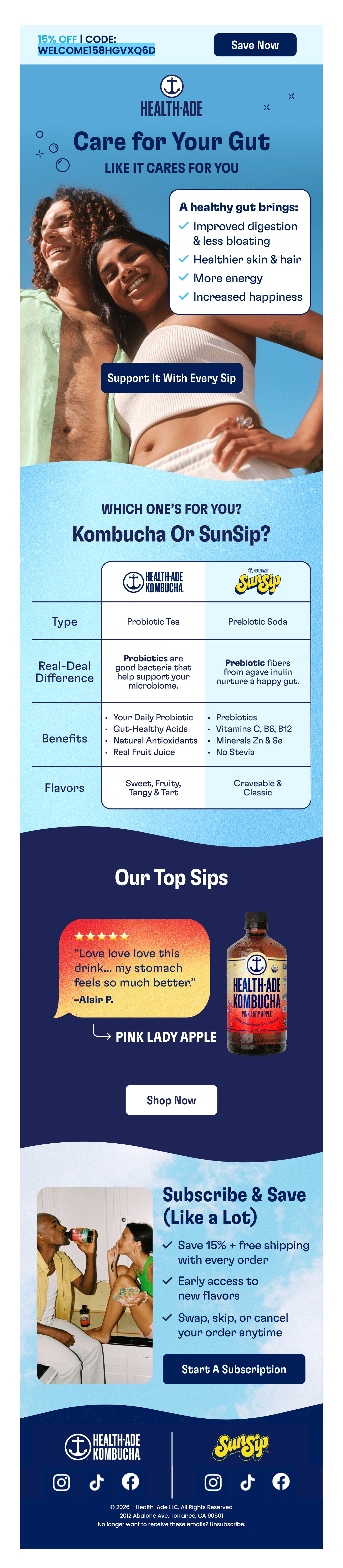 Browse Health-Ade's complete welcome email sequence — every email, subject line, timing, and design deconstructed. See exactly how their 6-email flow converts new subscribers.