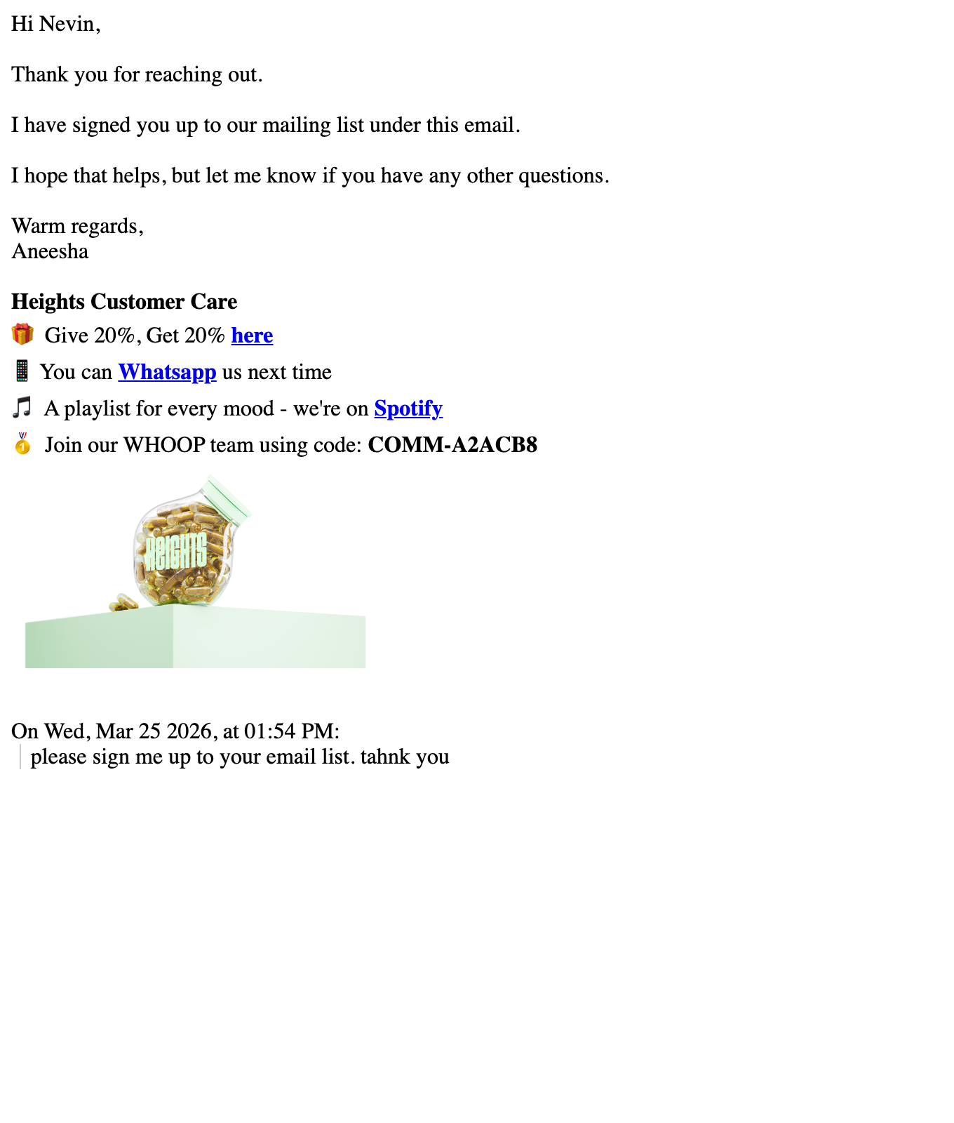 Browse Heights's complete welcome email sequence — every email, subject line, timing, and design deconstructed. See exactly how their 1-email flow converts new subscribers.