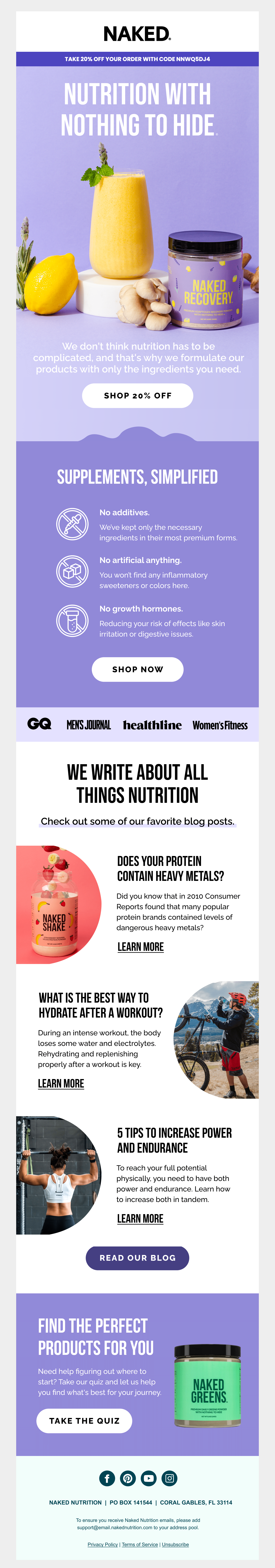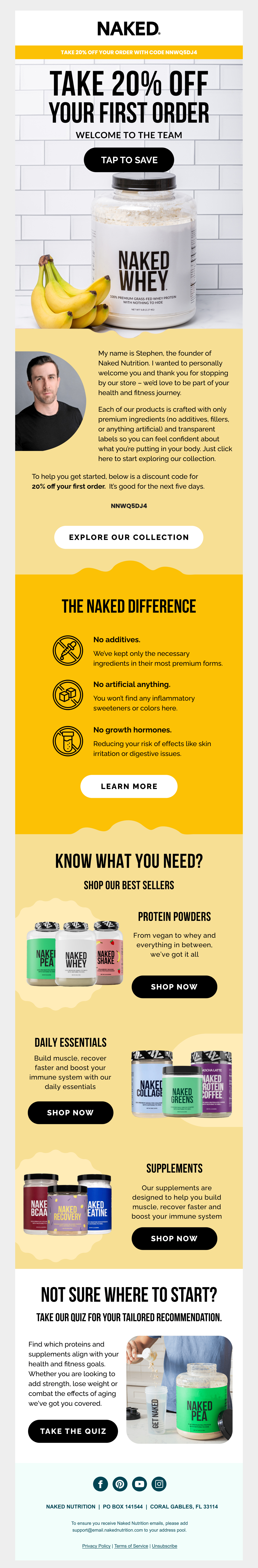 Browse Naked Nutrition's complete welcome email sequence — every email, subject line, timing, and design deconstructed. See exactly how their 2-email flow converts new subscribers.
