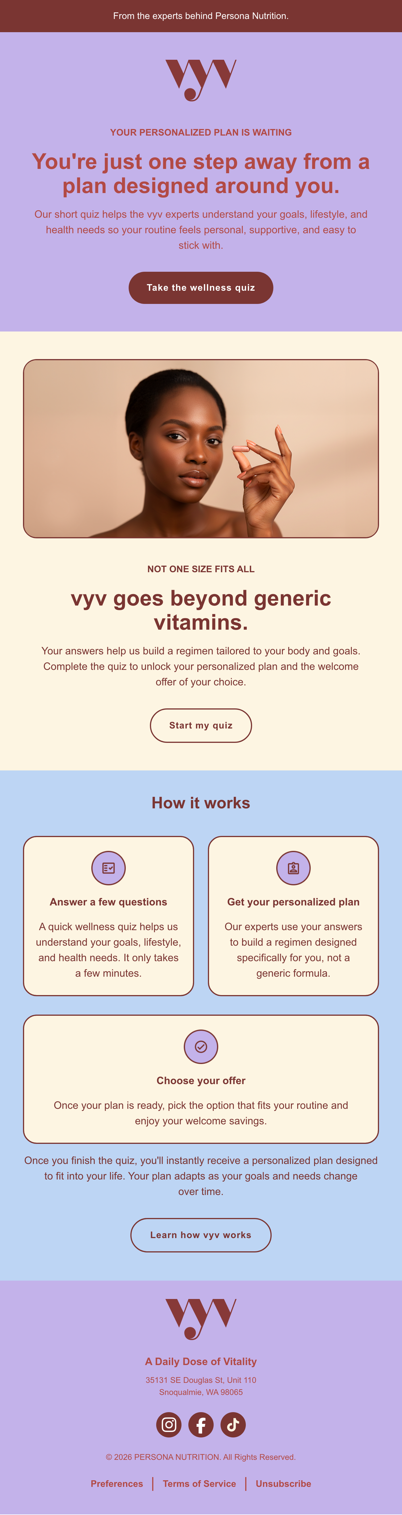 Browse VYV Nutrition's complete welcome email sequence — every email, subject line, timing, and design deconstructed. See exactly how their 2-email flow converts new subscribers.